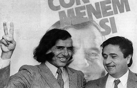 | Né le 05 octobre 1941 à Lomas de Zamora dans la province de Buenos Aires, cet homme a déjà occupé de nombreux postes politiques dont celui de Président de la République par intérim lors de la crise de 2001-2002. Après des études de droit à l’université de Buenos Aires, Eduardo Duhalde devient avocat en 1970. Déjà à cette date, il milite pour le parti justicialiste (parti péroniste) et s’engage en politique en devenant conseillé municipal de sa ville d’origine puis maire par intérim. Eloigné de la politique par la dictature militaire qui règne de 1976 à 1983, il reprend sa carrière d’avocat et défend certains péronistes persécutés par le régime. Au lendemain du retour à la démocratie, il récupère son poste de maire à Lomas de Zamora. Grâce à nombre de ses projets, notamment la création d’une agence –pionnière en son genre- de prévention et d’aide aux personnes droguées, il accroit sa popularité dans la province de Buenos Aires. Ceci lui permet de se faire davantage connaître en ville et de parvenir au poste de député en 1987. Alors récemment élu au poste de Président du Parti Justicialiste, Carlos Menem devient en quelque sorte le mentor de Duhalde avec qui il se rapproche de plus en plus. C’est ainsi que ce dernier se retrouve sur le ticket de Menem aux élections présidentielles de 1989 ; le Parti Justicialiste ayant remporté les élections, Duhalde devient alors vice-président de la République durant un temps et par conséquent Président du Sénat. Toutefois, celui-ci a d’autres ambitions c’est pourquoi il se retire assez rapidement de ses fonctions pour se présenter en tant que gouverneur de Buenos Aires. En effet, avec 38% de la population totale du pays et 32% du PIB, la gouvernance de la province de Buenos Aires représente le second poste le plus convoité après la Présidence du pays. Photo : Duhalde "menemista" dès 1989. Il l'accompagnera jusqu'en 1999. |