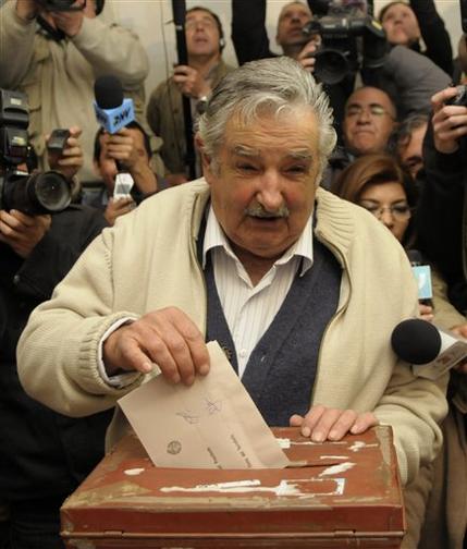 | «El Pepe», 75 ans, a passé quinze ans de sa vie en prison. Ex-guérillero des Tupamaros, Mouvement de Libération Nationale qui prôna l'action directe et la guérilla urbaine dans les années 1960 et 1970, il a été détenu en tant qu'otage par la dictature de 1973-1985. Les Tupamaros reflétaient la culture nationale d’un pays démocratique et pacifique en menant des opérations où la ruse primait sur la force brutale. On sait que de nombreux Tupamaros ont préféré se faire tuer plutôt que de tirer les premiers sur des policiers ou des militaires (d’où leur image de Robin des Bois parmi la population). Amnistié au retour de la démocratie, en 1985, il abandonne la lutte armée pour s'engager dans la voie électorale, en co-fondant le Mouvement de Participation Populaire (MPP), qu'il dirige. En 1994, il est élu député sur la liste 609 (à l’époque d’extrême gauche, et qui regroupe plusieurs groupes autour du MPP), puis sénateur en 1999. Dans le privé, José Mujica vend des fleurs avec sa femme, Lucía Topolansky, tandis que son langage populaire, faisant appel à des métaphores issues de l'imaginaire gaucho, ainsi que ses capacités de négociation contribue à l'imposer sur la scène politique. A la fin des années 1990, il est élu président du Congrès uruguayen, poste qu’il occupera pendant plus de 10 ans. Réélu sénateur en 2004, il est désigné ministre de l’Agriculture sous Tabaré Vázquez. Mais à l’occasion d’un remaniement ministériel en Mars 2008, Mujica est poussé à démissionner et reprend son rôle de sénateur. Toutefois, il continue de rendre visite aux chefs d'Etat voisins (Kirchner en Argentine, alors en pleine « guerre du papier » contre l'Uruguay; Lula au Brésil,..) si bien que, s'il n'est pas alors véritablement considéré comme présidentiable en Uruguay, les autres présidents américains le considèrent comme tel. |